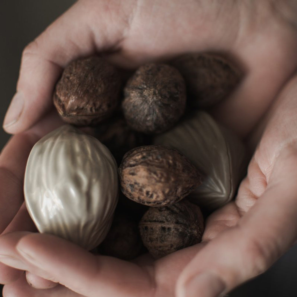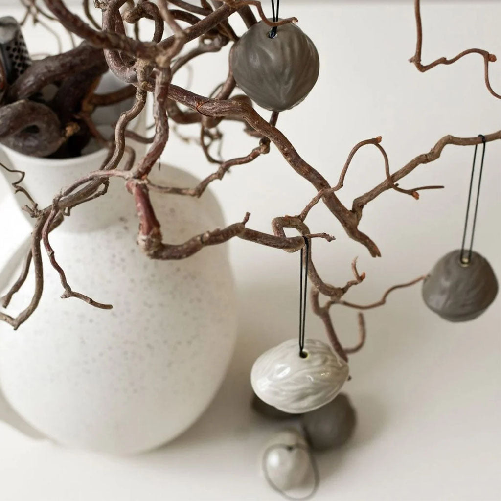 Moderner und minimalistischer Keramikanhänger in Form einer Walnuss. Er passt hervorragend zu jedem Wohn- und Einrichtungsstil und sieht sowohl am Christbaum als auch an einem Ast wunderschön aus. Ebenfalls kann man die Walnüsse auch toll in Schalen oder einem Kranz dekorieren.