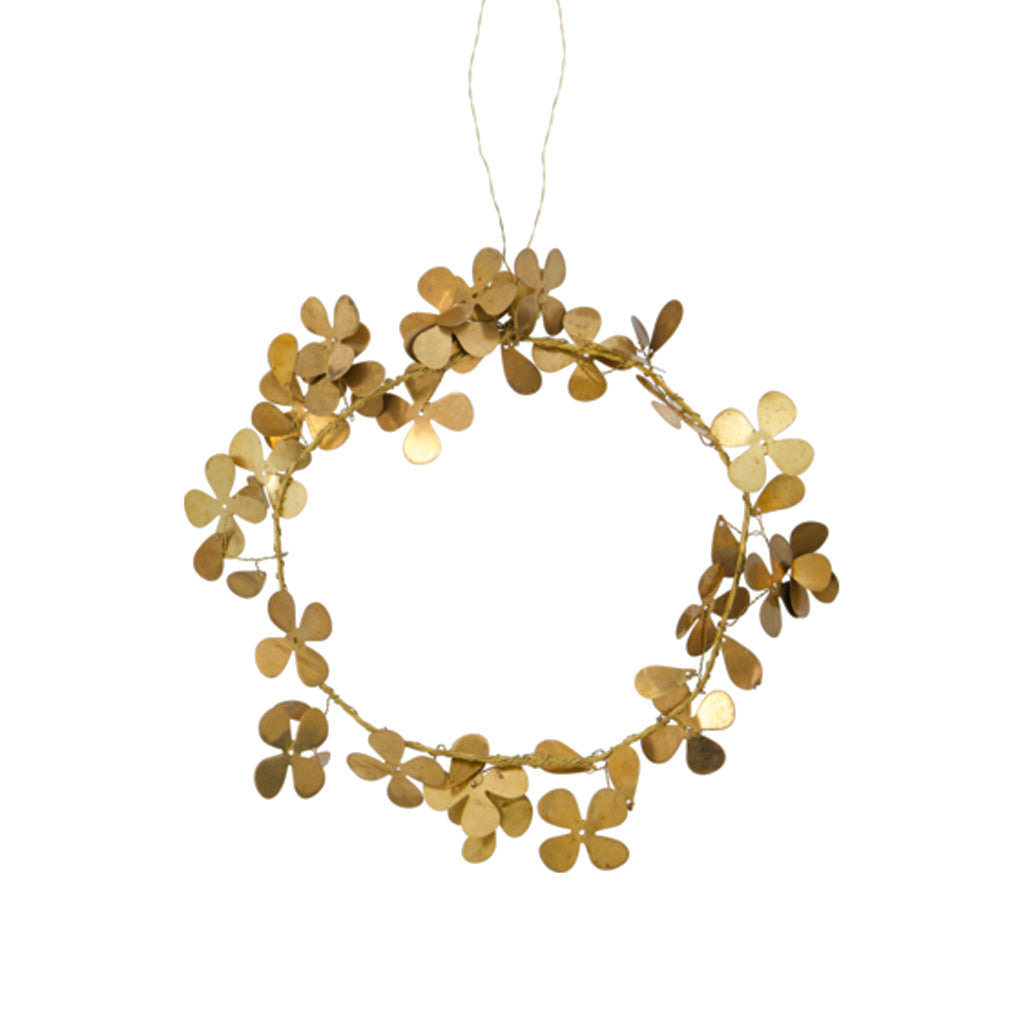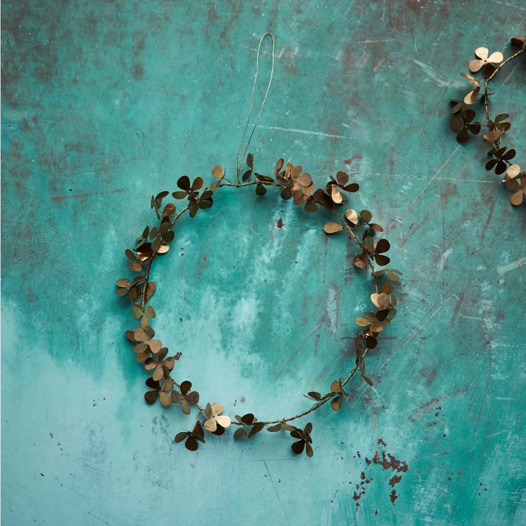 Handgemachten Kranz mit Kleeblättern und matter Messingoptik. An die Wand, oder ins Fenster gehängt, sorgt der Kranz für eine lässige Eleganz.