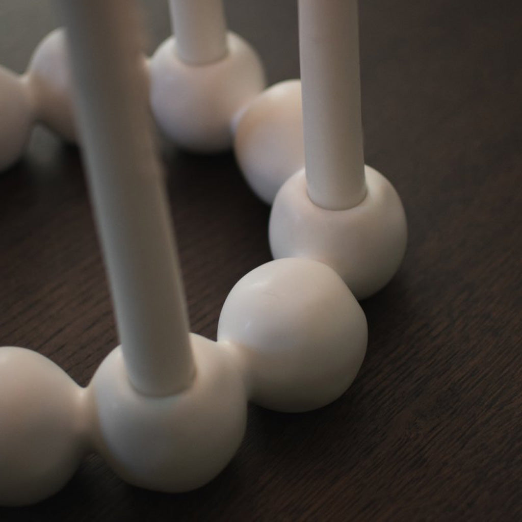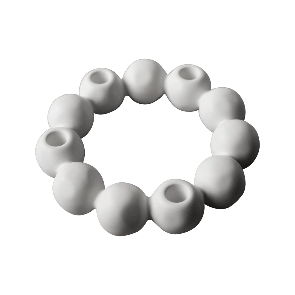 Moderner Kerzenhalter aus weißer Keramik. Der Kranz besteht aus weißen Keramikkugeln, die an Schneekugeln oder Schneebälle erinnern. In unregelmäßigen Abständen sind 4 Kerzenhalter in die Kugeln eingearbeitet, in die normale Stabkerzen passen.