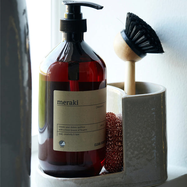 Der Spülbürstenhalter ist aus strapazierfähigem Steingut gefertigt und sorgt für Ordnung und einen dekorativen Look am Spülbeckenrand. Der Halter bietet sowohl Platz für Spülbürste als auch für Spülmittel und ist in einem stilvollen Design gestaltet, das zu einer wunderbar natürlichen Atmosphäre in der Küche beiträgt.