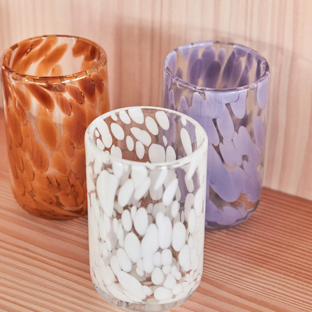 Dickwandige Gläser mit Tupfen in einem schlichten Design. Die Serie ist vielseitig und eignet sich sowohl für sommerliche Tischdekoration im Freien als auch für einen modernen Touch auf dem Weihnachtstisch, als Trinkglas, Vase oder Teelichthalter. Die Gläser werden in Handarbeit hergestellt, so dass jedes einzelne Stück ein Unikat ist, dass sich in Größe, Form und Design unterscheidet.